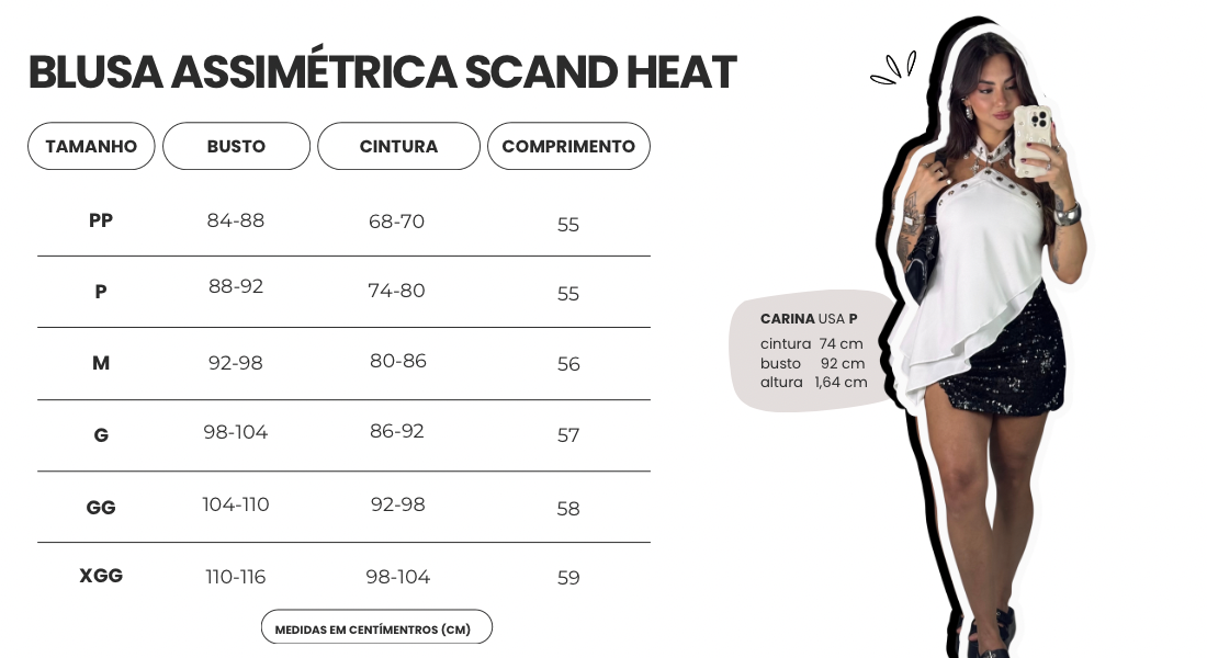 A Blusa Assimétrica Scandal Heat é pra quem entra no ambiente e muda a energia. Recorte assimétrico marcante, ilhós metálicos e caimento leve que acompanha o corpo sem prender.